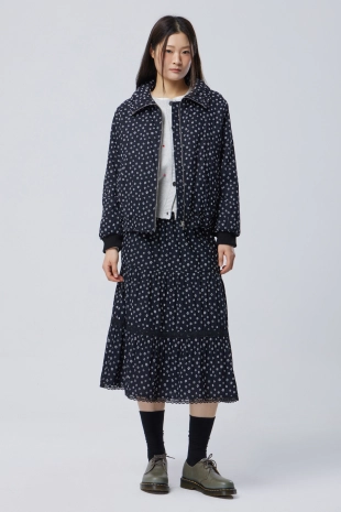 앞면 프릴 패널과 뒷면 셔링 디테일로 러블리한 무드를 연출함.